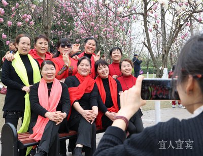 市民游客在宜宾丽雅公园与盛开的玉兰花合影