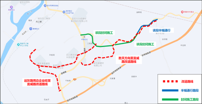 半幅通行施工路段:由 [胜天] 前往 [宜威路] 的往来车辆,可选择 [老宜长路→老宜长路半幅通行路段(路宽3m)→老宜长路→308亩村道改道→电厂专用通道→宜威路] 通行。