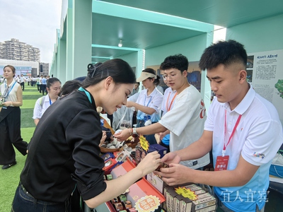 宜宾馆内人头攒动,屏山中都果果、屏山炒青、宜宾燃面等特产琳琅满目,吸引着一波又一波的消费者品尝、购买。