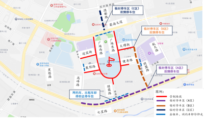 设定临时的出租车、网约车上/下车点,分别为:七星路(绿茵路路口两侧)、同盟路(健身路路口处)、蜀南大道(酒都剧场旁)、高峰路(展馆路路口处)