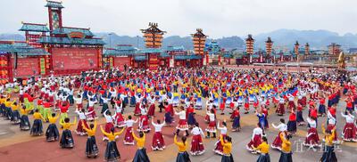 庆国庆、迎中秋,10月4日,筠连县“万人赛锅庄 共跳同心舞”锅庄舞展演比赛在南丝绸之路不夜城精彩上演。