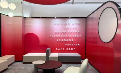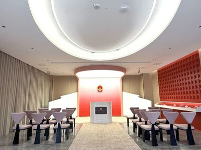 中式颁证厅以传统红色为主色调,背景中央装饰大红“双喜”,整体营造出庄重喜庆的氛围。现代颁证厅则以柔和的粉色渐变为主色调,厅内国徽悬挂正中,彰显婚姻的法律庄严与神圣。